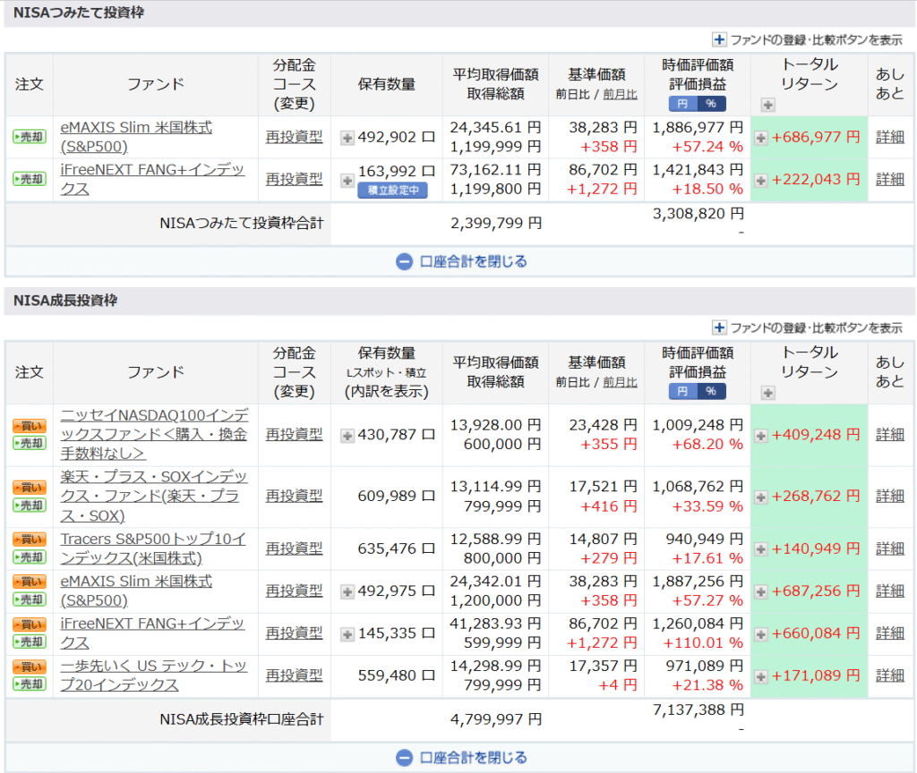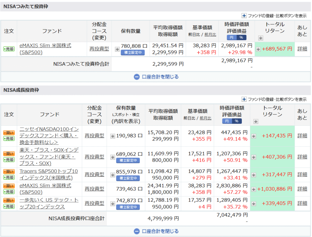 - 夫婦ともに、つみたて投資枠・成長投資枠を活用し、S&P500やNASDAQ100、FANG+などのインデックスファンドに投資しています。