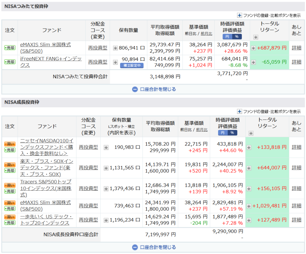 全投資信託で評価額が下がり成長投資枠全体では32万円のマイナスとなりました。